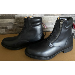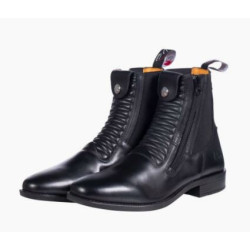- YKK®-ritssluiting achteraan voor het eenvoudig aan- en uittrekken, gesteund door lederen strook met drukknop
