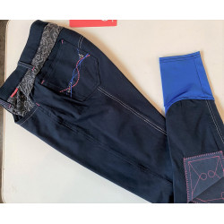 Gekruiste riemlussen en achter een brede riemlus in contrastkleur met “QHP” borduring